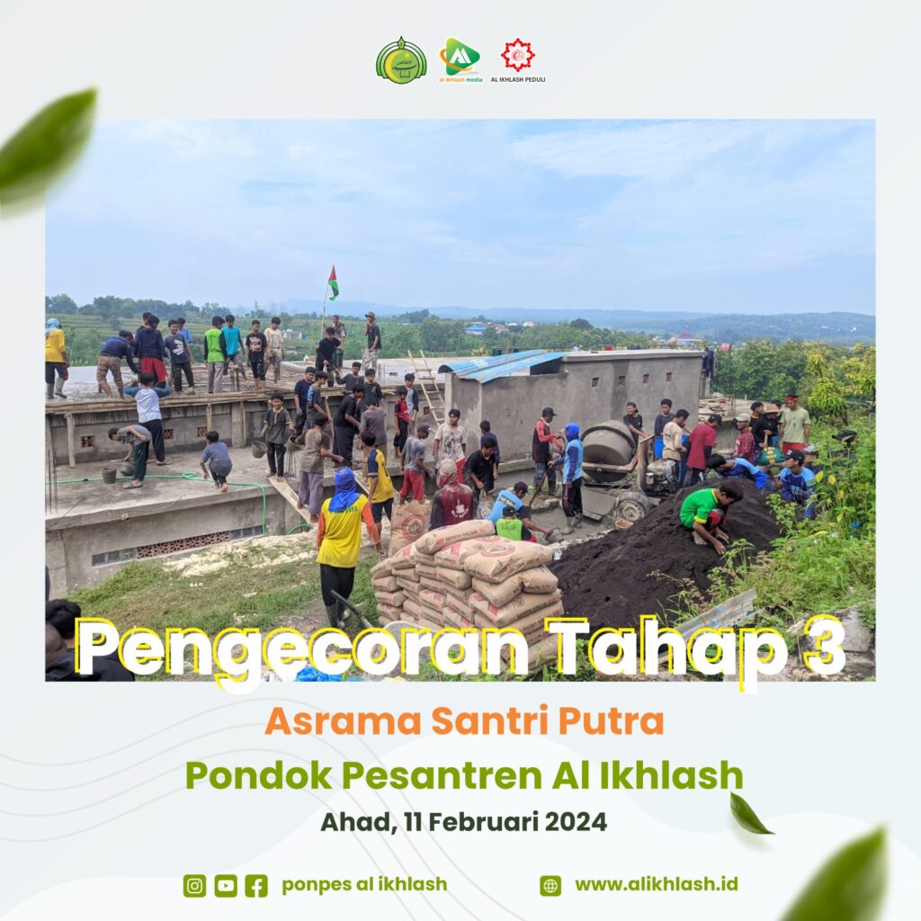 Alhamdulillah atas izin Allah ﷻ hari ini Ahad, 11 February 2025 terlaksana kegiatan mengecor asrama pondok putra, ini merupakan bagian dari proses pembangunan asrama di pondok putra tahap III dimana sebelumnya telah selesai proses pembangunan dua lokal asrama santri. setelah pengerjaan asrama santri 3 lokal ini maka insyaallah akan dilanjutkan dengan pembangunan masjid al ikhlash putra.